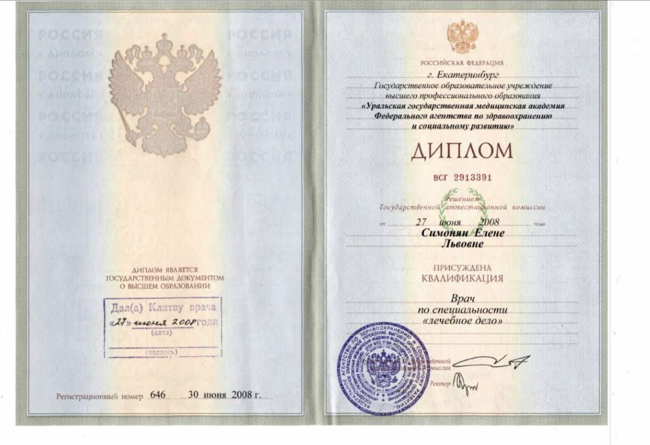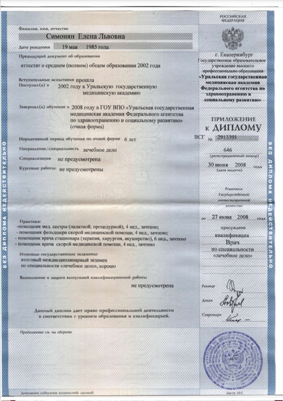 В 2008 году – окончила Уральскую Государственную Медицинскую Академию по специальности «лечебное дело».